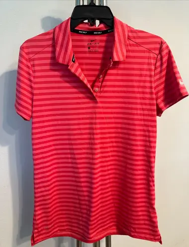 This is a Nikes ladies golf tee dry, fit, like new condition, two-tone pink stripe polo style