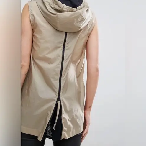 Beige sleeveless top with hood. Nike logo on front. Drawstring detail. Has hood. Lots of mesh. Unz... Show more