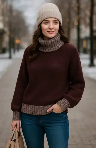 Elegant burgundy sweater with a warm turtleneck. Taupe accents on collar and cuffs. Ideal for cool w... Show more