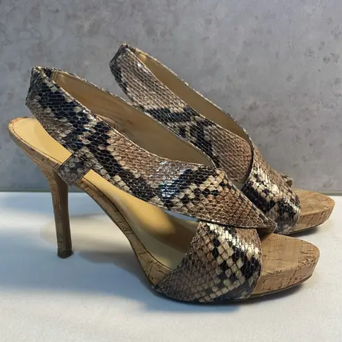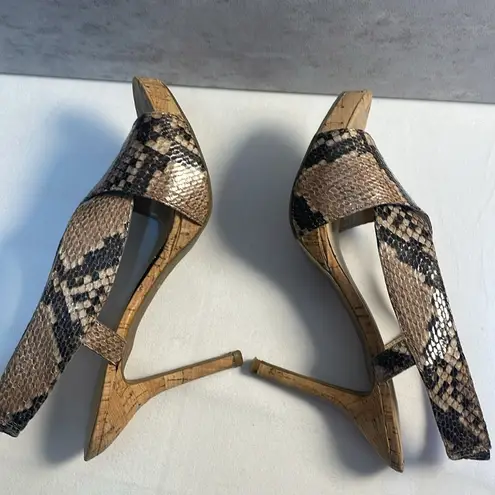 In excellent preowned condition! NINE WEST Snakeskin Cork Bottom 4” Heels Crossover Straps Sandals... Show more