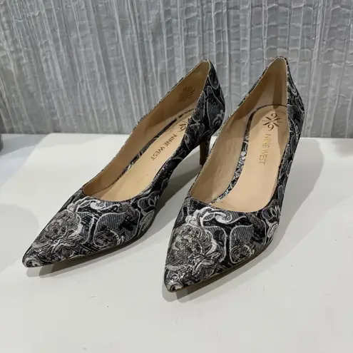 Nine West Pointed Toe Pumps Heels 8 Black Silver Floral Brocade Kitten Heel - $18 - From Midori