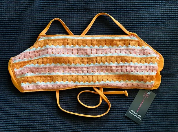 Elevate your beach day style with this chic No Boundaries bikini top. The orange and white striped p... Show more