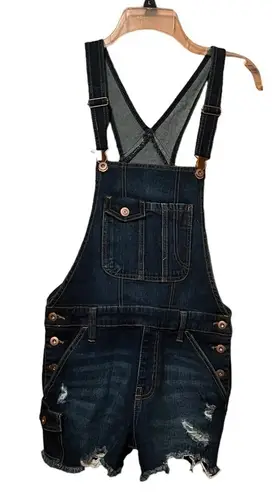 No Boundaries women's overalls shorts in size medium. Dark wash, cut-off, distressed denim. Excellen... Show more