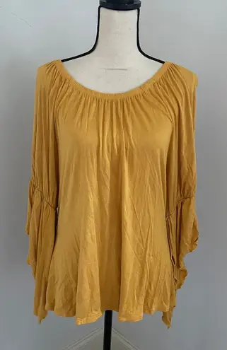 condition: excellent material: rayon, spandex measurements: 19" pit to pit, 27" shoulder to hem notes: boho, renaissance, bell sleeve tags: #boho #mustard #renaissance #casual #tiered #fallfits #peasant #y2k #pleated #flaresleeve #bohemian #cottagecore #victorian #fairygrunge #fairy P&S Bell Sleeve Boho Blouse Medium Mustard Yellow Tiered Sleeve Peasant Shirt M