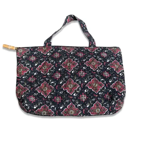 Quilted cotton tote bag in black with red tan and ivory medallion print Structured soft quilted fabr... Show more