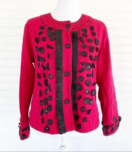 So cute, versatile. Can be wirn all year long. Lightweight for summer, but also perfect for holidays and Valentine's. Red with black circles and sequins 4 button closure Lined, 100% cotton shell 100% polyester lining Will be steamed prior to shipping Size Large 22" bust 23" length Smoke and pet free home Lngslv 4