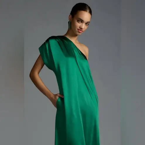 The product is a stunning NWOT Anthropologie Porridge One-Shoulder Green Satin Maxi Dress in size XL... Show more