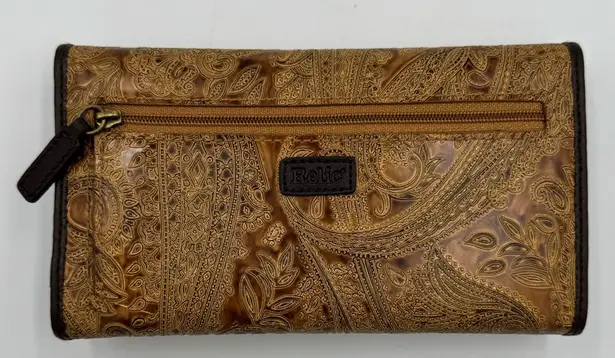 Elegant tri-fold wallet with intricate paisley design. Features a convenient front zipper. Opens to a checkbook insert, change pocket and multiple credit card slots. Measures approximately 7.5x4.5x1"