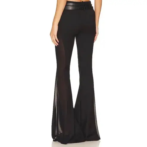 1st fabric: 64% polyester 33% viscose 3% elastane 2nd: 100% viscose belt cattle leather particulars metallic fiber. Made in Italy. Wash the 2 garments separately on reverse. Zip fly with hook and bar closure. Attached waist belt with buckle closure. 3-pocket design. Sheer paneling at side. AREC-WP5. 1R5230. R23-192
