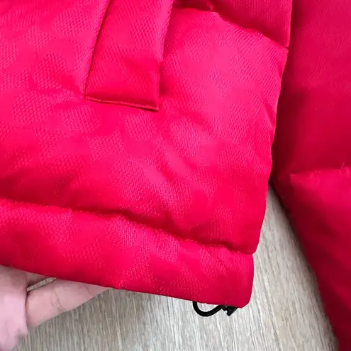 Stay warm and stylish with this luxury Coach Signature Jacquard Puffer Jacket in vibrant red. Crafte... Show more
