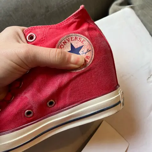 Step out in style with these vibrant red Converse high heel sneakers. Distressed style. Perfect for... Show more