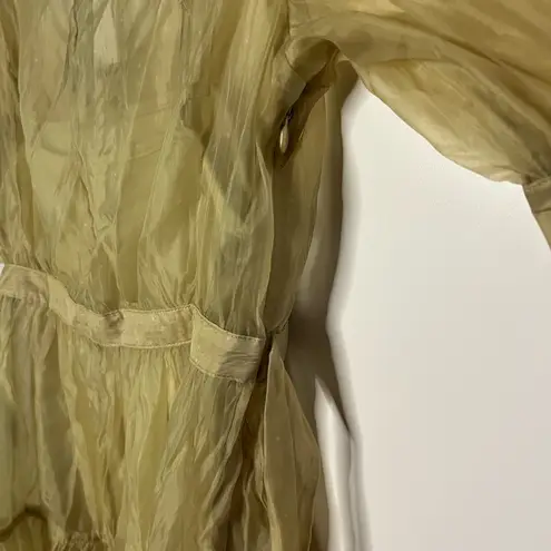 Sheer puff sleeve organza overlay with slip included. Waist band with tie. Subtle polka dot print at the waist and hem of sleeves. Item is new with tags. Very cottagecore fairy core. Size med Pit to pit 14” Waist 10” Length 25”