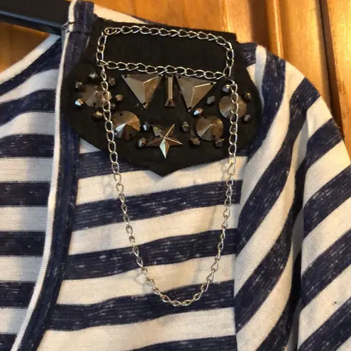NWT Fleurish Navy & White Stripe Embellished Shirt size Medium. Heathered navy stripe with studs and chain detail on shoulders. 65% rayon 35% polyester. Brand new no flaws from a smoke free home. Armpit to armpit is 16.5 inches.