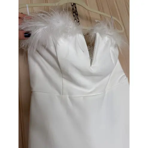 Impress everyone in this techno crepe knit dress with a fluffy, feather-trimmed straight neckline that boasts a flirty notched detail (with V-bar support and hidden no-slip strips). The fitted bodice includes supportive side boning and sits atop a high waist that continues into a figure-flaunting mermaid maxi skirt. Hidden back zipper/clasp.