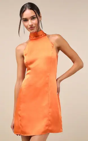 he Lulus Infinite Admiration Orange Satin Halter Mini Dress is the sophisticated party dress that everyone will love! Sleek woven satin shapes this lovely dress that has a princess-seamed bodice and a high halter neckline that ties above a back keyhole cutout. A figure-skimming silhouette falls to a flirty mini hem. Hidden back zipper.