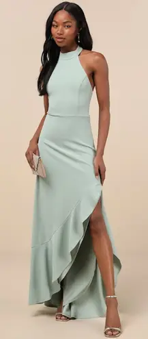The way you look in the Lulus Majestic Perfection Sage Green Ruffled Halter Maxi Dress will have everyone in a trance! This stunning dress has a stretchy crepe knit composition that shapes a princess-seamed bodice and a halter neckline that secures above the open back with covered button loops. High, fitted waist sits atop a figure-flattering maxi skirt with a ruffled side slit that carries into an asymmetrical, high-low hem. Hidden back zipper/clasp.