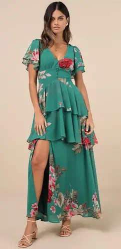 Dance under the stars in the Lulus Midnight Mood Teal Green Floral Tiered Maxi Dress! A bright floral print dances across sheer woven chiffon shapes this twirl-ready dress with a V-neckline and double-ruffled short sleeves. Alluring open back is accented with a tying detail and a bit of smocking for fit. A flattering set-in waist, accented with a decorative placket of covered buttons, tops a full A-line maxi skirt with twirly tiers and a sultry slit hem. Hidden side zipper.