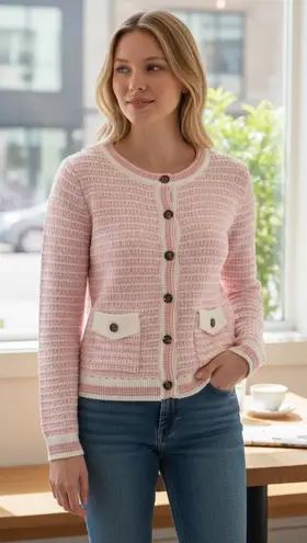 Color/pattern: pink and white Design details: front pockets Button front 48% acrylic, 32% polyester,... Show more
