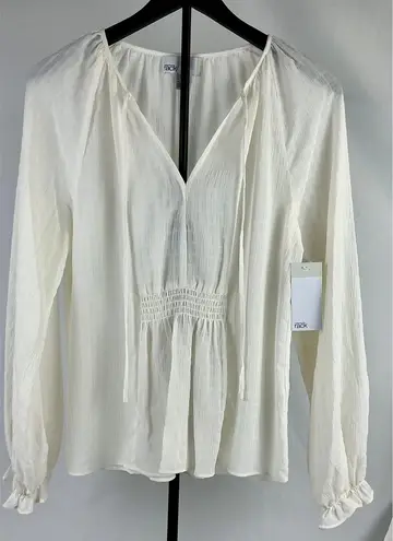 Keywords: Nordstrom Rack, peasant blouse, ivory cloud, tie neck, long sleeve blouse, womens top, bohemian blouse, romantic top, casual blouse, ruffled cuff, semi-sheer, white blouse, size small
