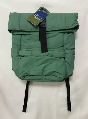 NWT Open Story Puffer Backpack The Open Story Puffer Backpack is a 16-inch backpack that is water-resistant and has a fold-over top. It has a spacious interior, an exterior zip pocket, and a padded laptop sleeve that can fit up to a 15-inch laptop. It also has padded shoulder straps and a suitcase handle. The backpack uses zip closures and buckle straps to keep items secure.