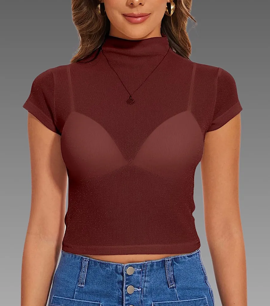NWT Sparkly Maroon See-Through Mock Neck Crop Tshirt Sz small Red - $19 New With Tags - From Emily