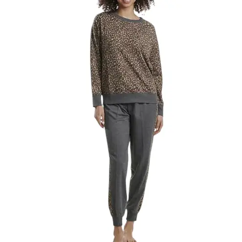 Soft knit fabric 2-piece set Leopard print Long sleeve top Jogger-style pants Elastic waistband Cont... Show more