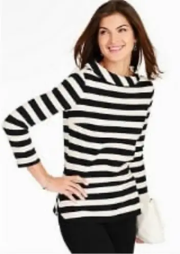Chic sophistication arrives in this Talbots striped top. A striking black and white striped pattern creates a visually appealing and versatile piece. The elegant cowl neck adds a touch of refinement, framing the face beautifully. Unique button-back closure adds an unexpected detail, elevating the design. Three-quarter sleeves offer a comfortable and stylish length, perfect for transitioning between seasons. This top is ideal for a business casual setting, a lunch date, or a weekend getaway.
