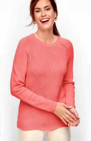 Beautiful Talbots Textured Knit Pointelle Sweater in a soft, feminine pink. This piece features a richly detailed raised knit pattern down the front, subtle pointelle detailing, and a slightly scalloped hem that adds a polished, elevated touch. Crew neckline and long sleeves with a smooth, comfortable feel.