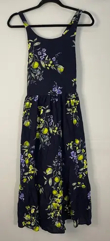 Navy blue maxi dress with a vibrant lemon and floral print. This dress features a flattering tie-bac... Show more