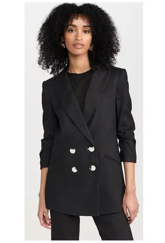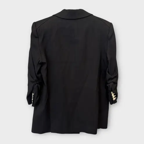 Fabric: Mid-weight, low-stretch suiting Peaked lapels and double-breasted button placket Padded shoulders Faux welt breast pocket and slant front pockets Elbow-length sleeves with ruched seams and button cuffs Shell: 55% linen/44% viscose/1% elastane Lined Lining: 100% polyester Dry clean Imported, Vietnam COLOR: Black Size: 10 Approximate measurements laying flat: Length 29.5" Bust 41" Sleeve length 19" Shoulder to shoulder 34" Condition: Brand new with tags.