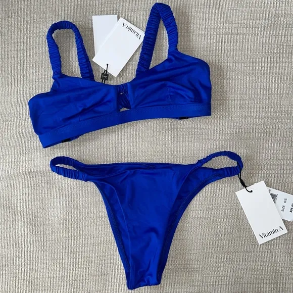 New with tags, perfect condition Vitamin A Bikini Set from Everything but Water, super cute set!! Royal blue beautiful color, runched strap details Top size 8/M (I think would fit S too), bought for $115 Bottom size 6/S, bought for $95 Set total retail $210