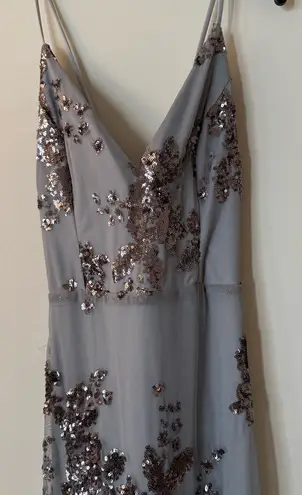 Stunning gray dress with floral sequin design. Perfect for prom or special events. Features a flatte... Show more