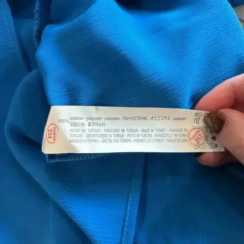 Solid Blue Collared Neckline Button-Down Front Ruffled Details Straight Hemline 100% Polyester Size... Show more