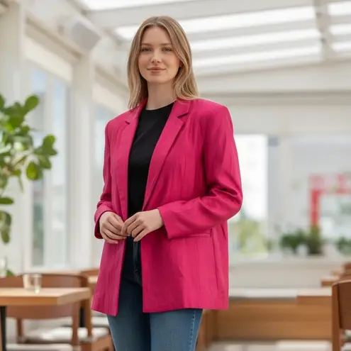 Bold fuchsia blazer with a sleek design. Perfect for adding a statement to your outfit. hot pink... Show more
