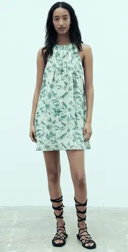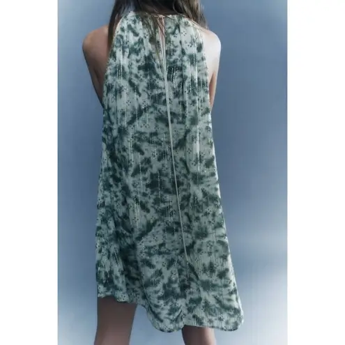 Mini dress made of viscose blend fabric. Halter neck with spaghetti straps. Metallic thread appliqué... Show more