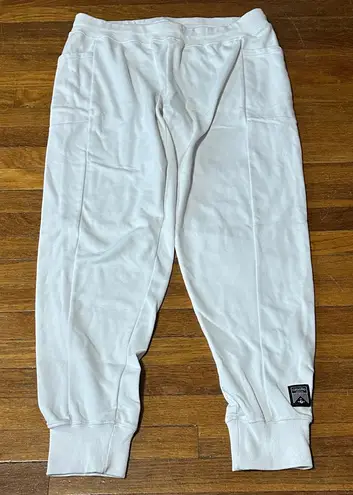 Soft jogger pants with ribbed cuffs. Ideal for lounging or light exercise. Measures 16 inches straight across the back waistband, rise is 10 inches and inseam is 30 inches. Shows wash wear at thighs. Hip pockets. Not perfect condition but so comfy! (Bin ?)