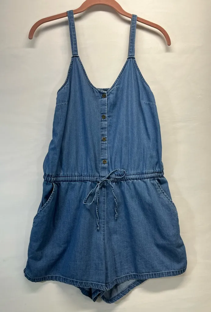 Chic denim romper with pockets and button front. Adjustable straps and drawstring waist, adjustable... Show more