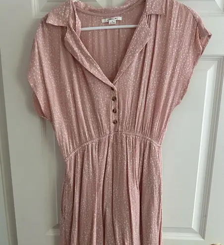 Stylish pink dress with a button-up front and delicate dotted pattern. Includes pockets. Note small... Show more