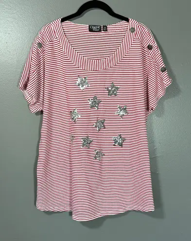 Women's plus size nautical americana top by Onque Casual. This red and white striped top has silver sequin stars, button accents on the shoulders, and a scoop neck. It is a cotton polyester blend. The top is a size 1X. When laying flat it measures approximately: Armpit to armpit: 27 inches Length: 28 inches The top is in amazing shape.