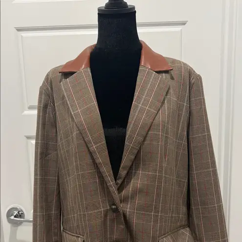 Stylish plaid blazer with leather accents. Features notched lapel and single-button closure.
