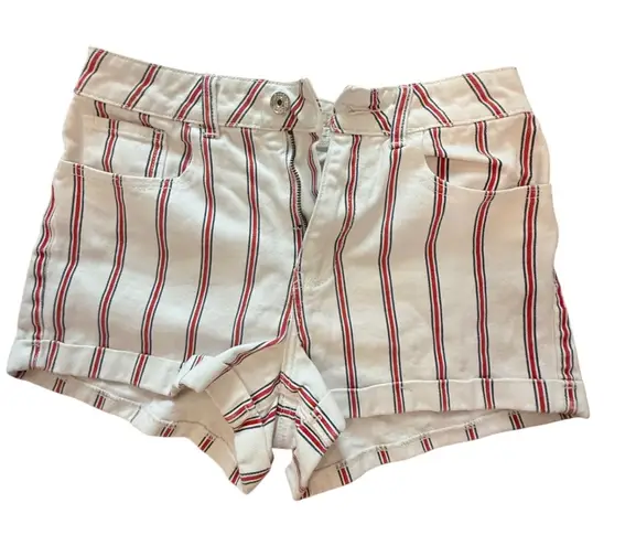 White denim mom shorts featuring red and blue stripes throughout. These shorts offer a classic high-... Show more