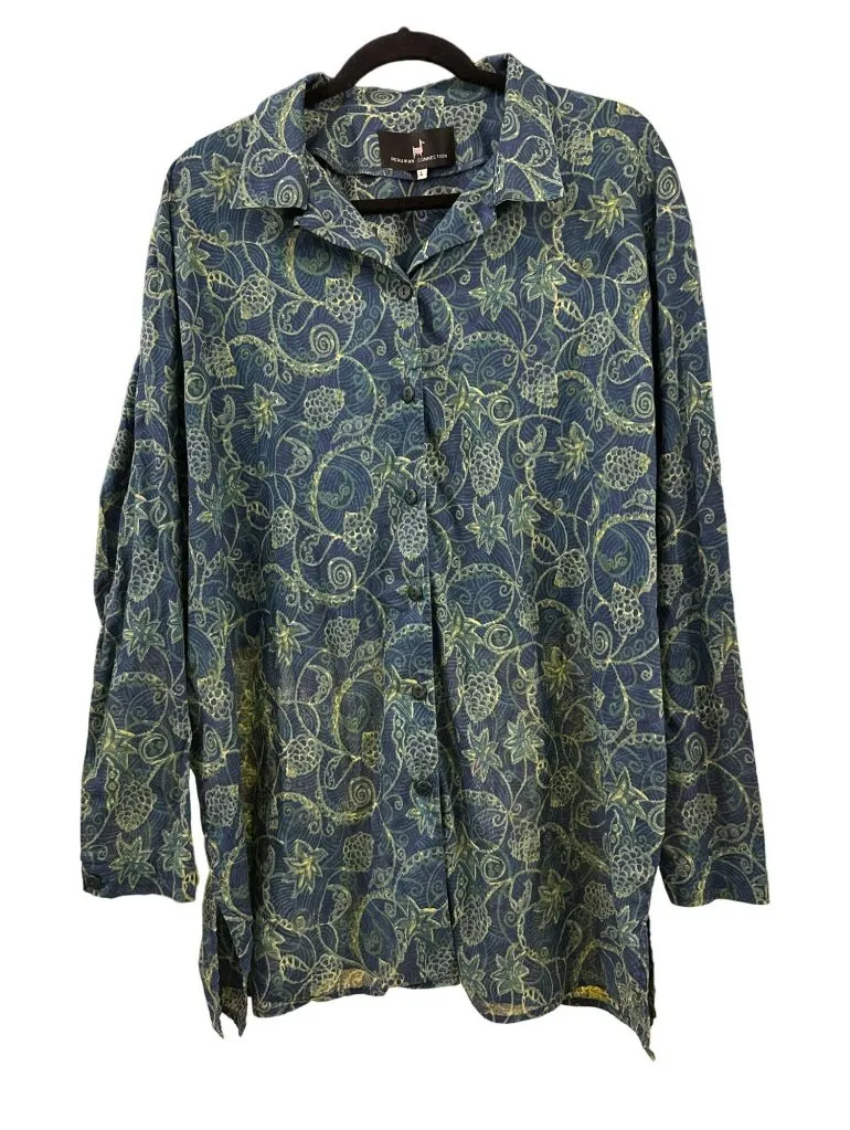 Peruvian Connection Size Large Button Up Tunic Shirt Beach Cover Up Excellent, no flaws seen Relaxed, very generous fit, check measurements Suitable for layering or a beach vacation coverup A stylish shirt crafted from 100% Pima Cotton, providing comfort and durability. This shirt features an intricate blue and green pattern, adding a touch of elegance. • Button-up front • Long sleeves • 100% Pima Cotton • Blue and green pattern • Made in Peru Slits at sides Approx measurements Top to bottom 32” Pit to pit flat approx 25.5” Sleeve 22”