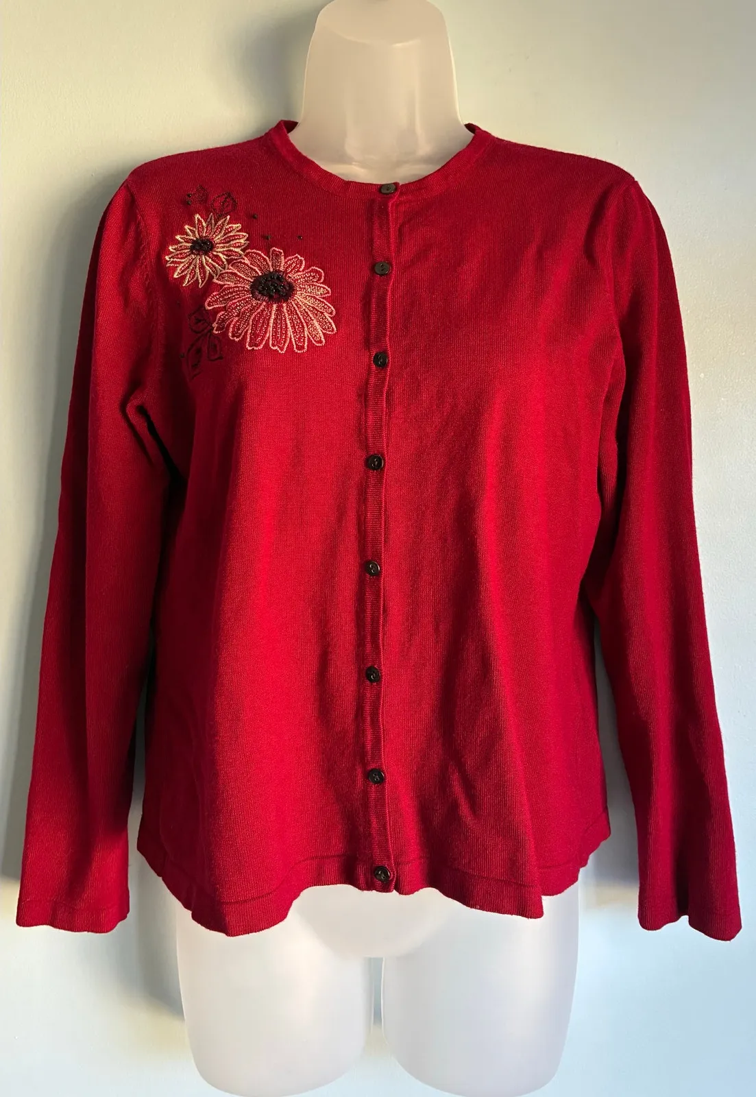Red and black Petite Sophisticate button front cardigan. Has floral embroidered and beaded pattern on one side. Colors: Red with black Size: Medium Good preowned condition. Smoke free home. See pictures for condition and measurements. Offers and questions welcome! Bundle and save! Box 27