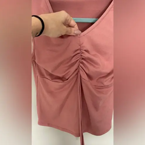 This charming blouse features a flutter sleeve design and a ruched tie front, all in a delightful pink hue. The short sleeves and soft fabric make it perfect for a stylish yet comfortable look. The V-neckline adds a touch of elegance to this versatile top.