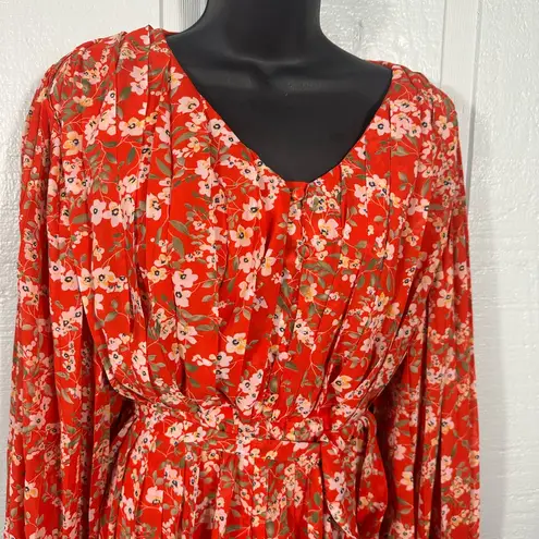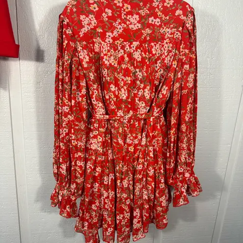 Pink Lily Red Floral Long Sleeve Short Romper Lined V Neck Size Medium EUC 17 inches pit to pit 14... Show more