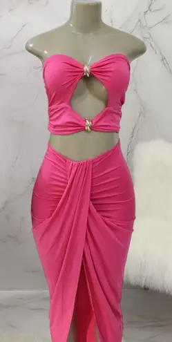 • Strapless top with gold ring center detail • Front cut-out design for a bold look • High-waisted skirt with ruched drape detail • Body-hugging, curve-enhancing fit • Soft, stretchy fabric for comfort Fit: true to size Condition: new Size: M
