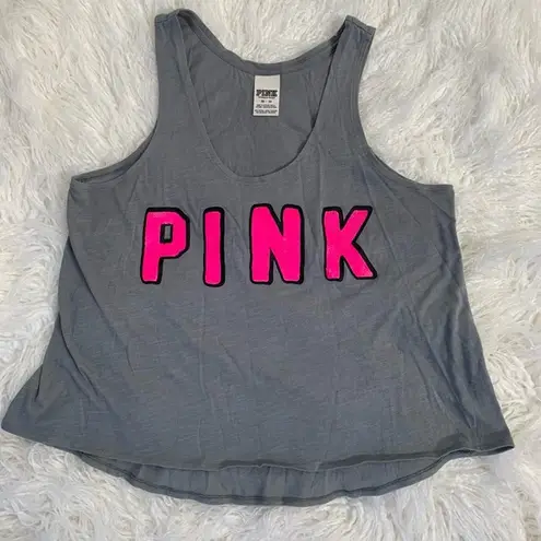 Victoria’s Secret loose flowy cropped tank with bright pink sequined outlined PINK logo in front. Ex... Show more