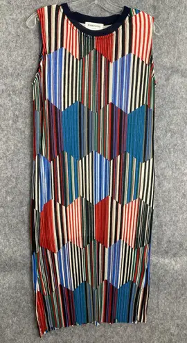 Striking midi dress featuring a vibrant geometric print, sure to turn heads. This sleeveless dress has a classic round neckline and a flattering silhouette that falls to a midi length. The all-over pleated design adds texture and visual interest, while side slits allow for ease of movement. This dress is perfect for a summer brunch, a casual wedding, or a stylish vacation. Measurements: • Length: 43 in • Width: 17 in Est Size Medium based on measurements Keywords: Pinkyotto, midi dress, sleeveless dress, pleated dress, geometric print, colorful dress, casual dress, summer dress, vacation dress, brunch outfit, women's fashion, round neck dress, side slit dress This is a preowned item and may show minor signs of wear. Please review all photos and reach out with any questions or offers! Packaged with care and shipped promptly.