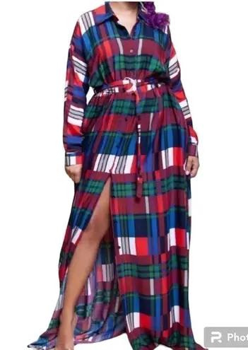 Plaid floor length maxi dress with matching belt, pockets and front buttons. (S) - $73 - From Kay