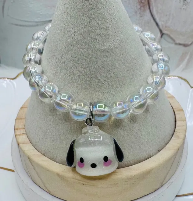 This stylish charm bracelet features 8mm clear beads with a cute Pochacco Charm centerpiece. The flexible and adjustable elasticity fits most wrist sizes, making it a perfect accessory.